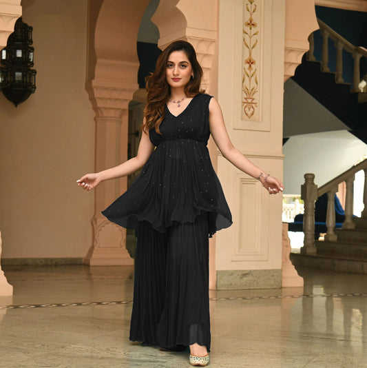 PRODUCT CODE : A-36INNER: MicroSTYLE: Crop Top With Palazzo And ShrugFABRIC : GeorgettePant : GeorgetteWORK:...