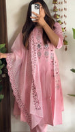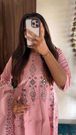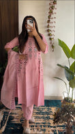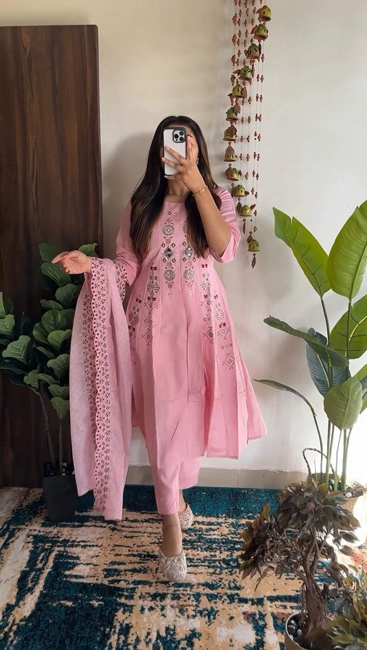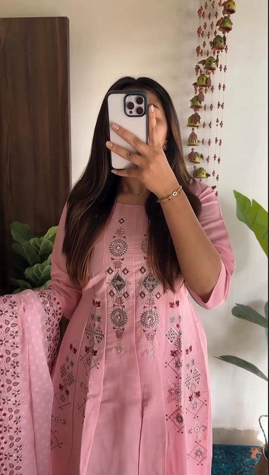 Beautiful & elegant pastel suit can brighten up any day. This Pink Silk Suit is decorated with intricate hand embroidery all-over. It is paired with matching pants and organza dupatta with tassels 🌸