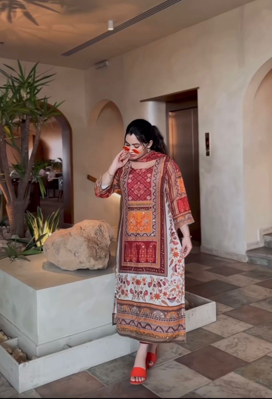 BEAUTUFUL MASLIN PRINTED AND REAL MIRROR WORK TOP AND PANT WITH PRINTED DUPATTA