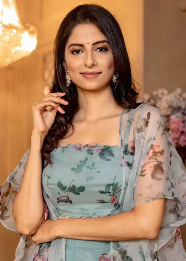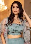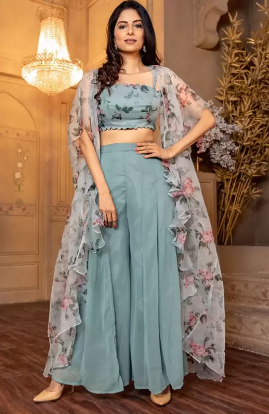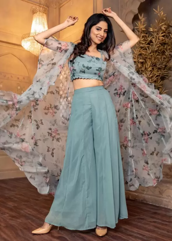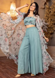 Blue Floral Top & Palazzo And Shrug (Set Of 3)