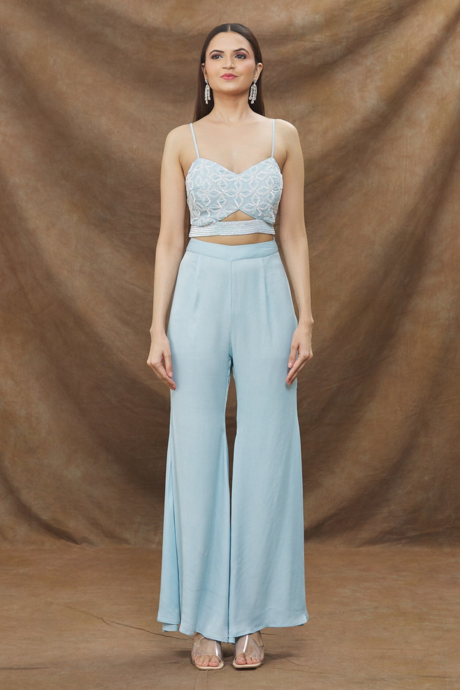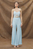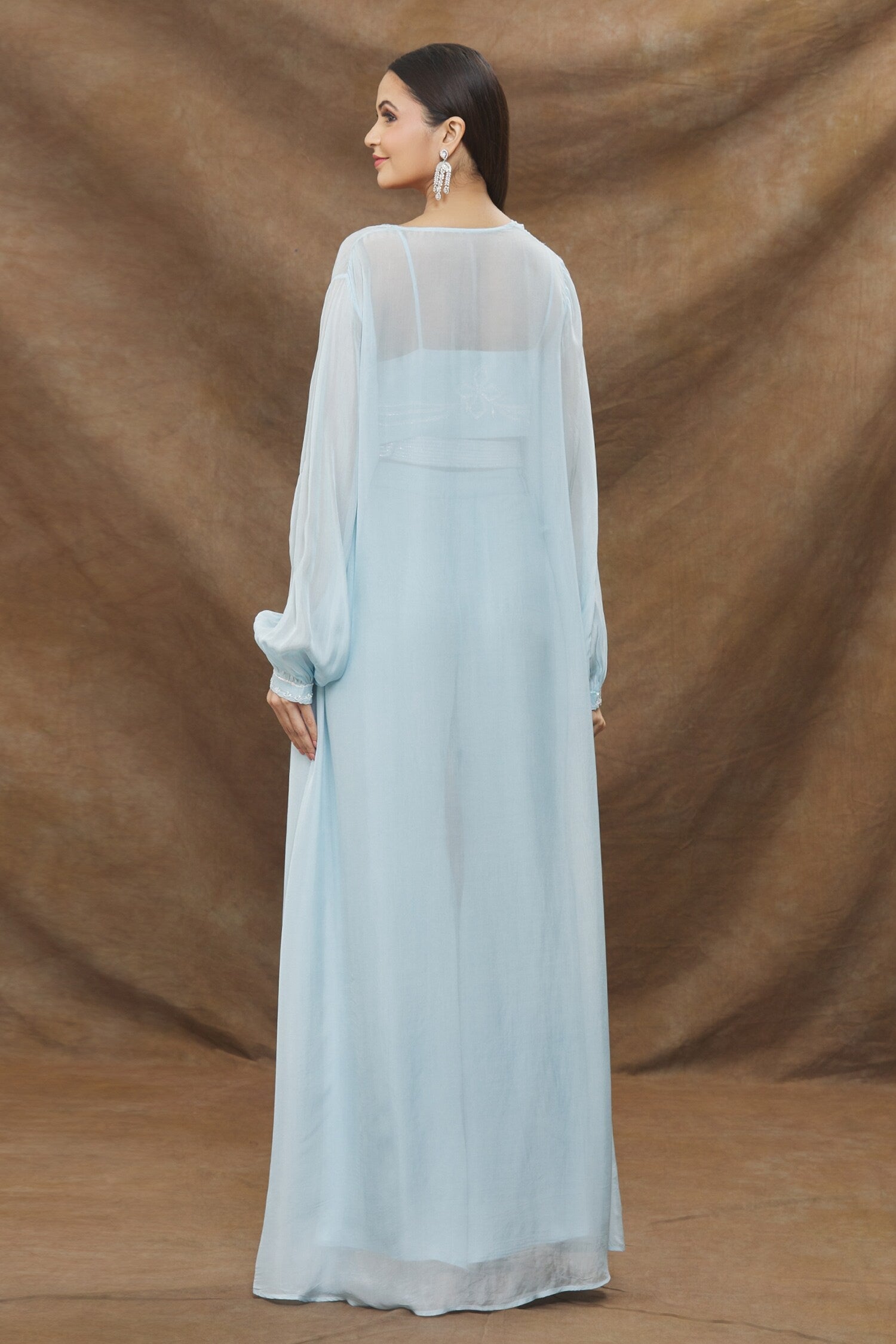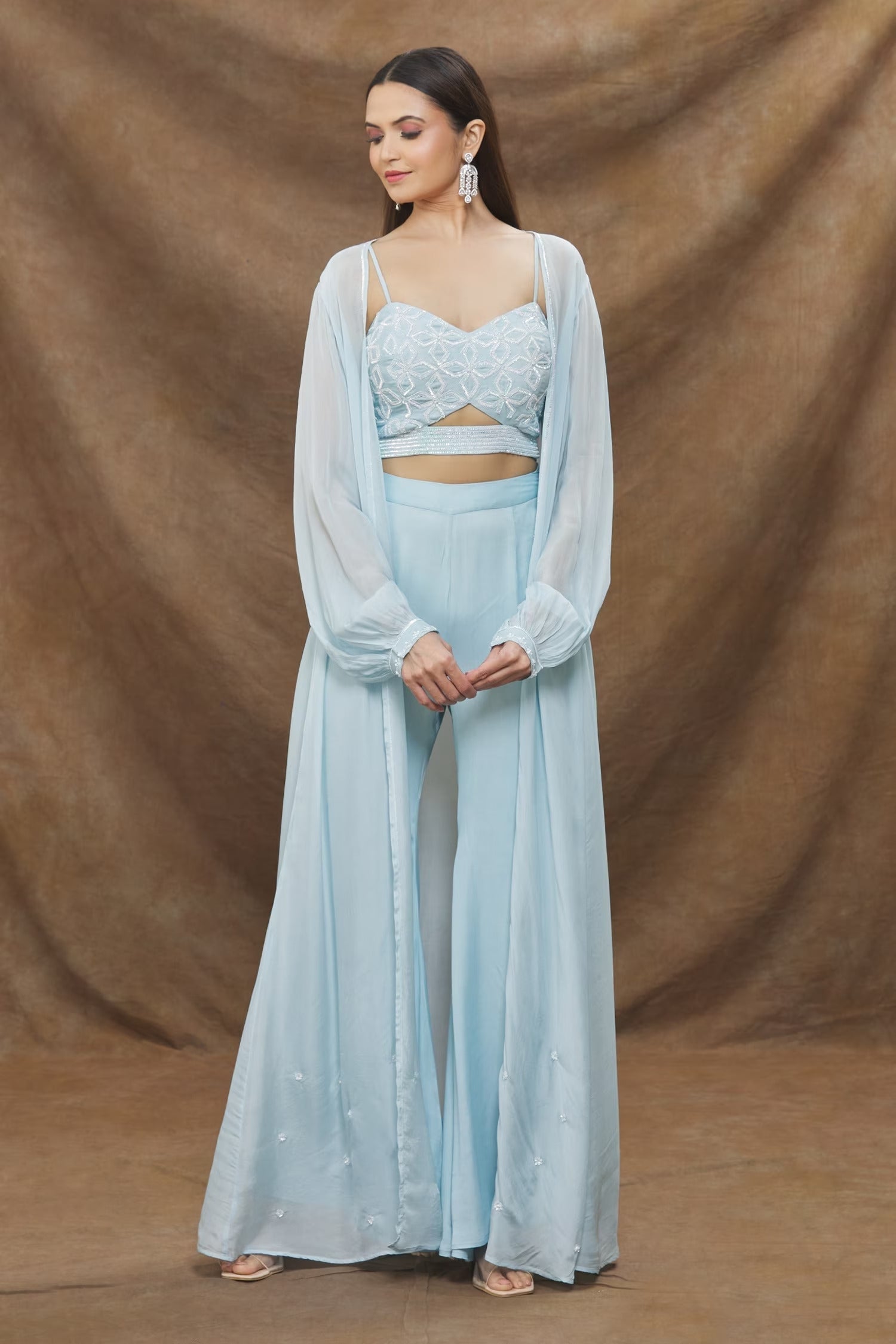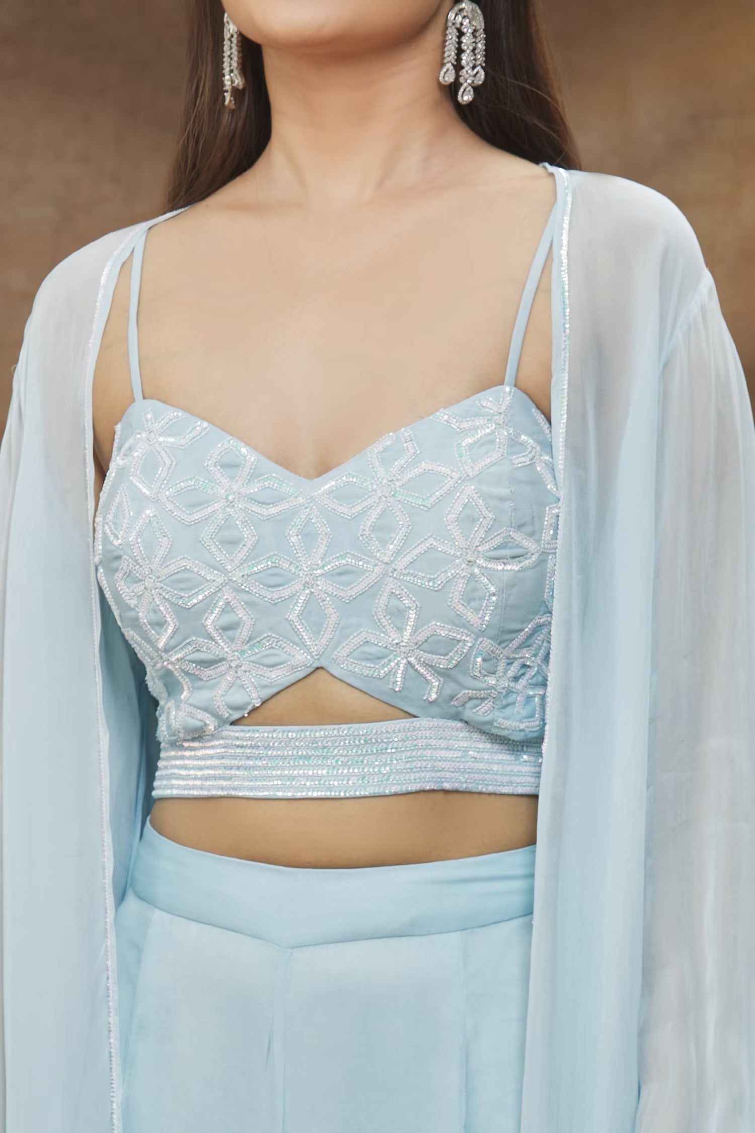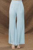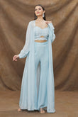 Blue Silk Satin Embroidery Sheer Sleeved Cape Bell Bottoms Pant Set For Women