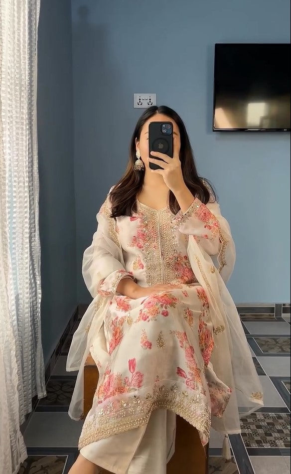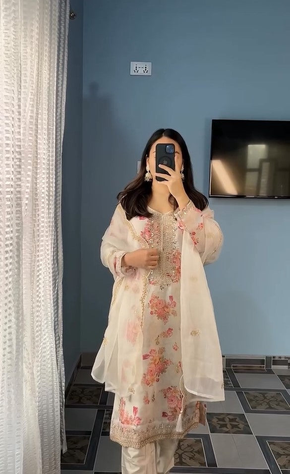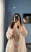 3 Piece Cotton Embroidered Dress, Front fully Embroidered, Embroidered Patch Attached on Neck, Daman and Sleeves. Organza Dupatta fully Embroidered, Heavy Patches Attached. Same color Plain Trouser. In Beautiful Cream Color.