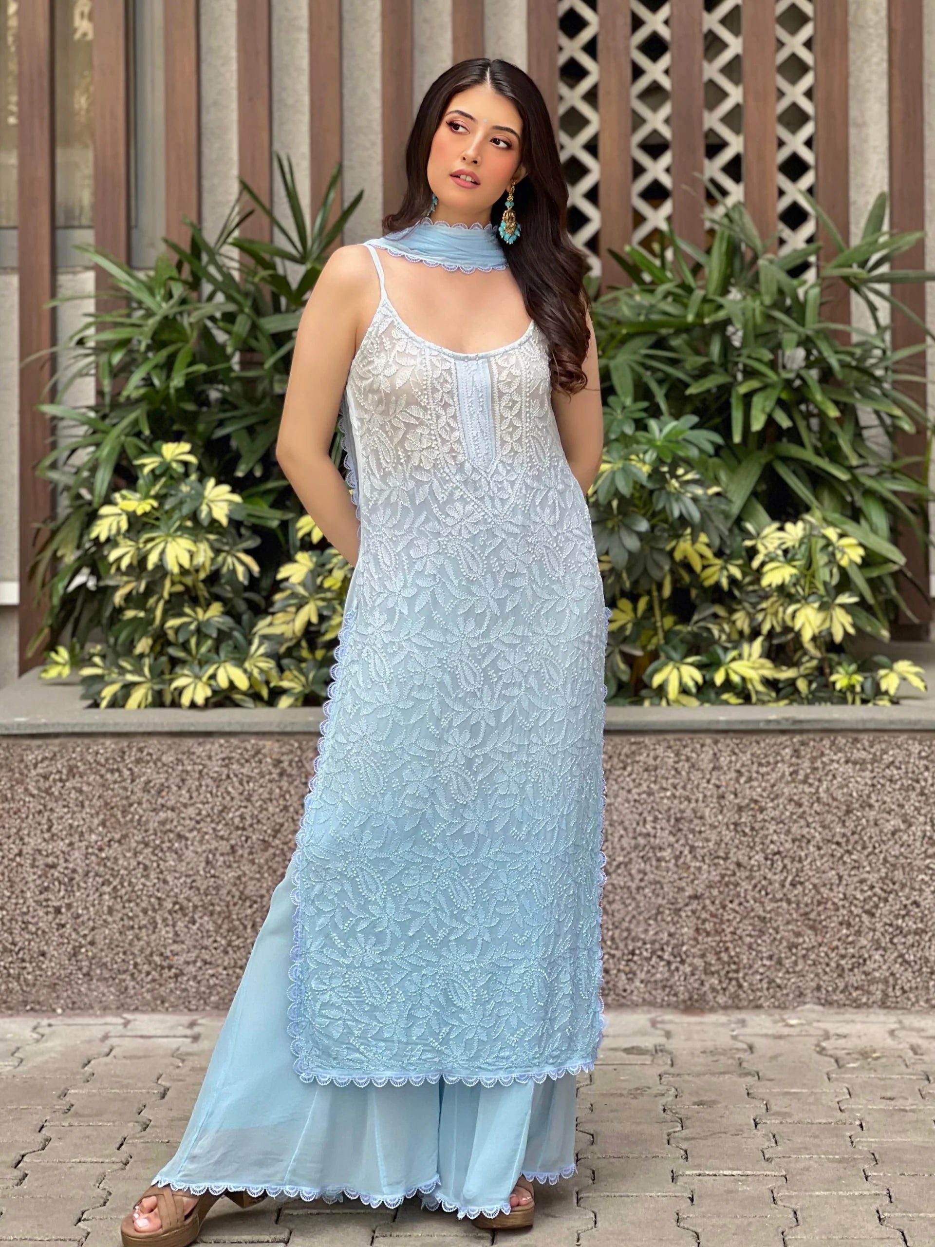 Dreamy Frost Chikankari Strappy Kurta Set (set of 3)