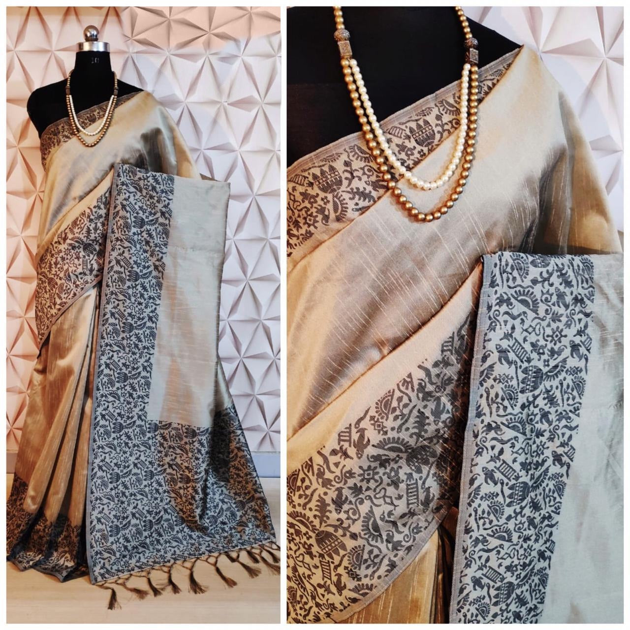 This beautiful pure tissue linen saree features dazzling golden zari weaving for a stunning, eye-catching look. The included running blouse completes the look for a perfect evening ensemble. Experience graceful style in this elegant piece. |