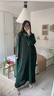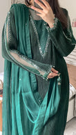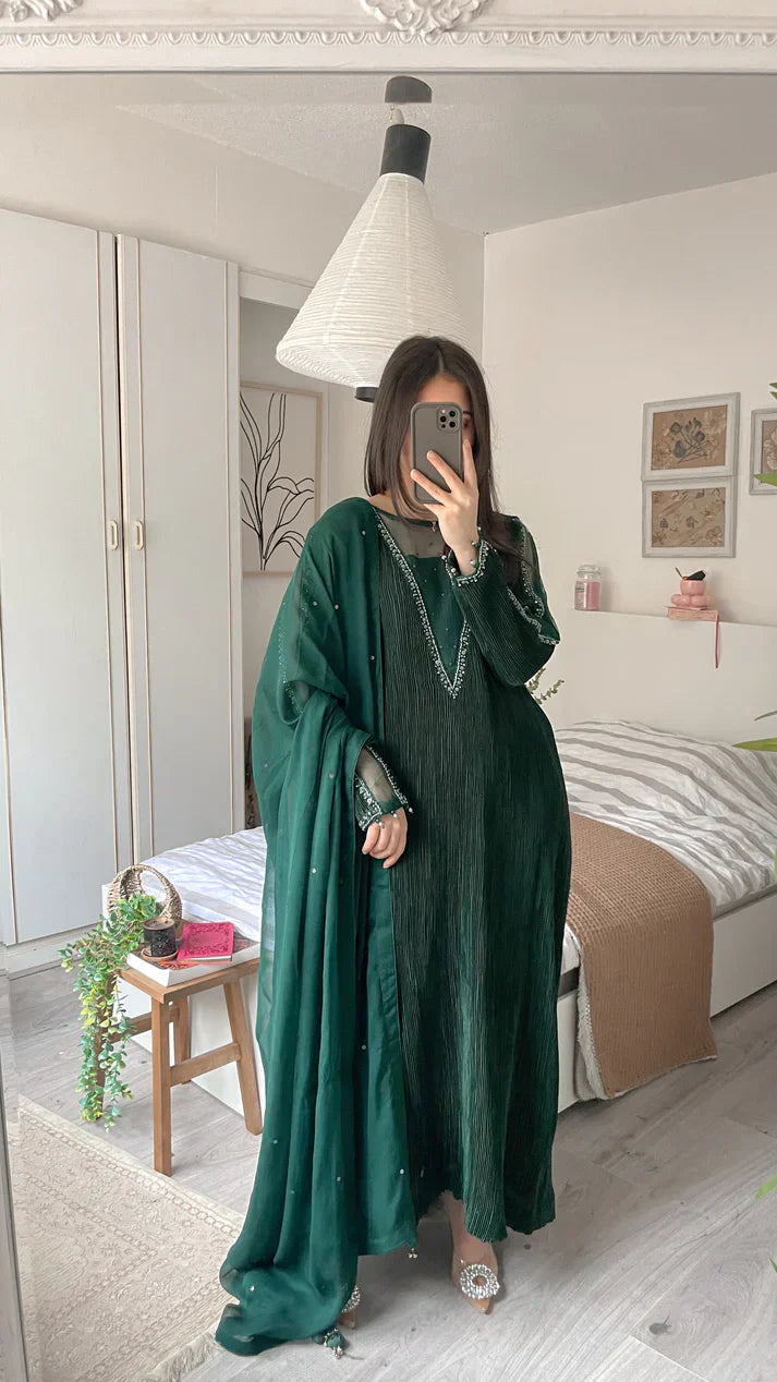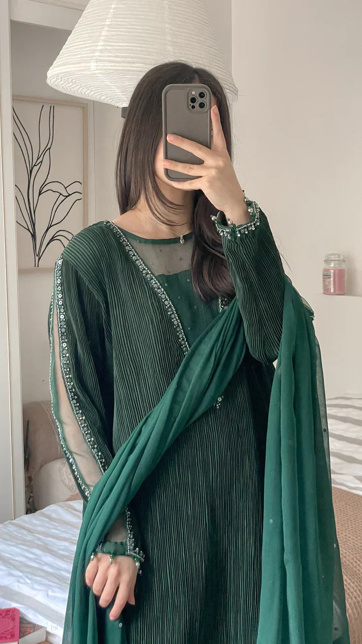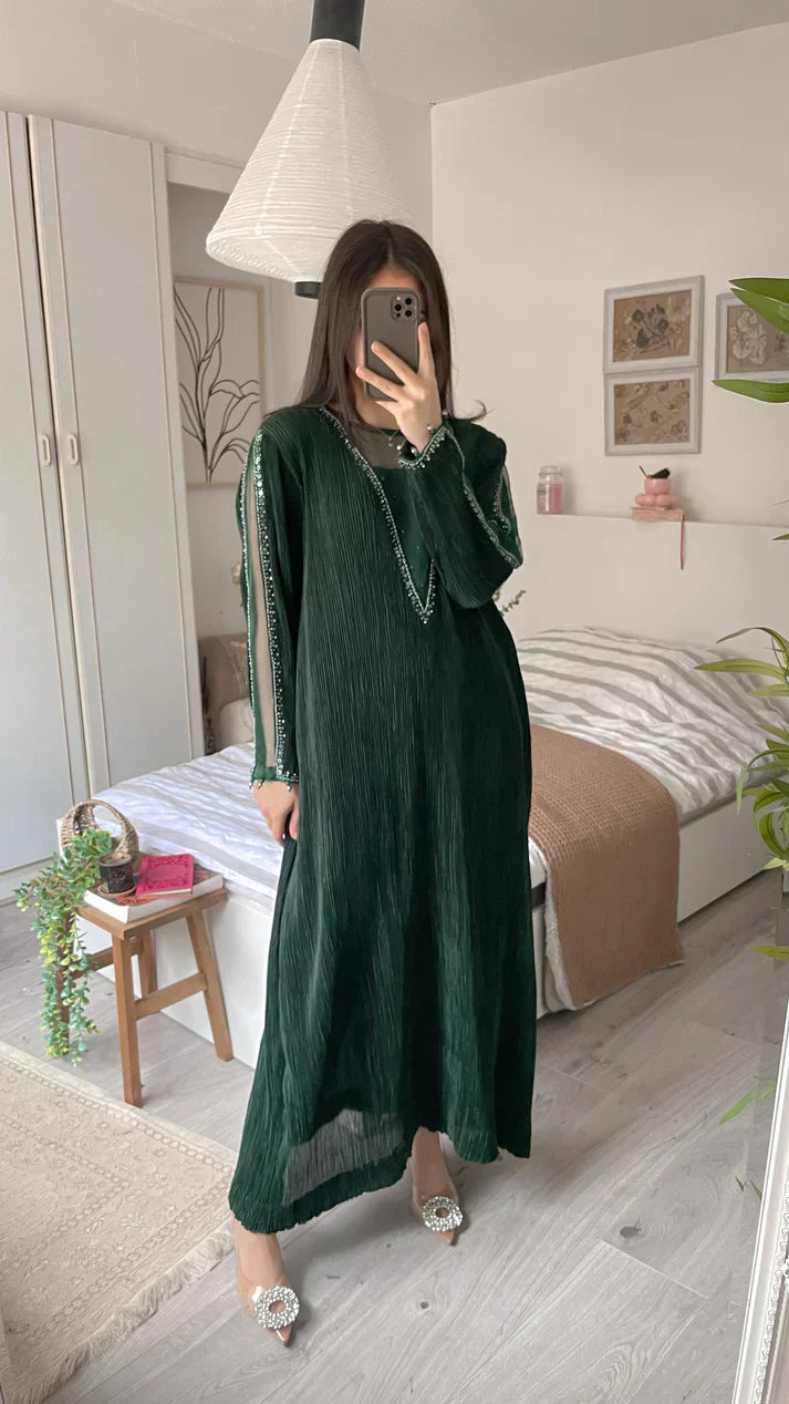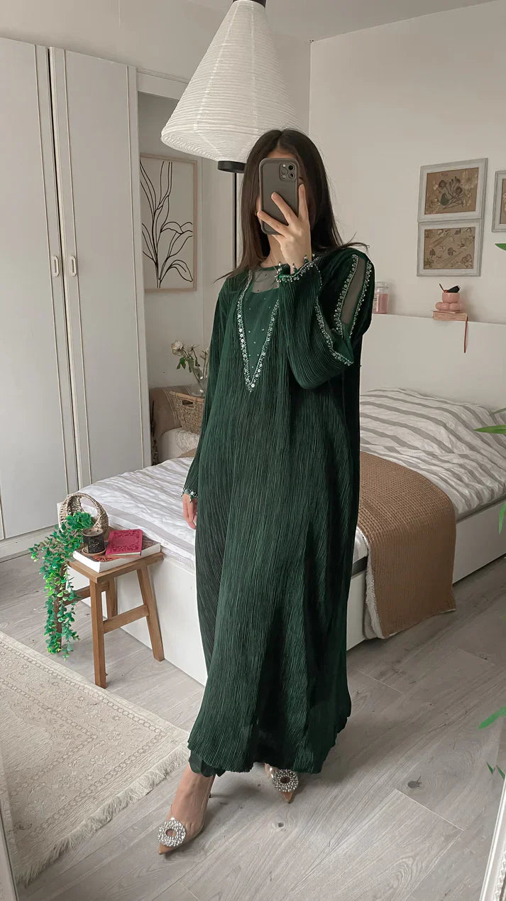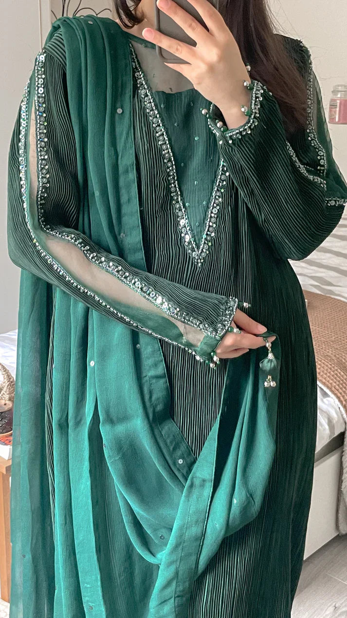 Stunning shade of green crushed loose style dress with stone neck work. The sleeves are stone and sequin work with an organza strip in middle. Super stylishÂ