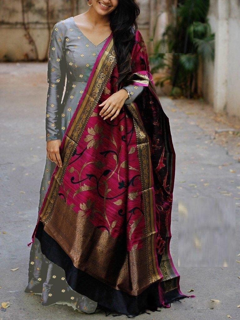 Grey Taffeta Butty Gown With Dupatta