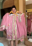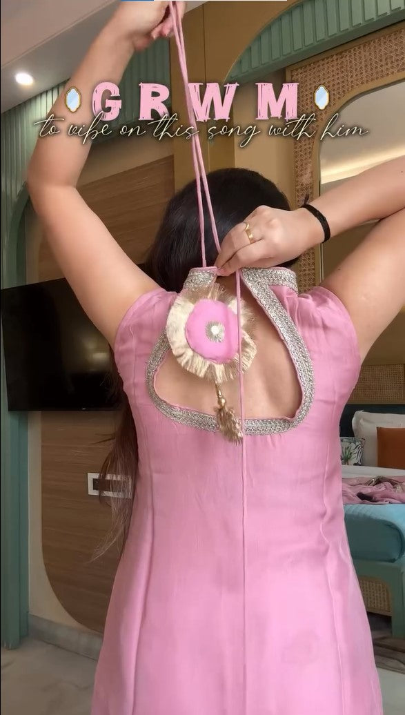 This dreamy sharara set in delicate organza, paired with a kacchi gota dupatta, is all about soft glam and festive grace. Flowy, feminine, and made to make heads turn—because subtle hues speak the loudest. 💫