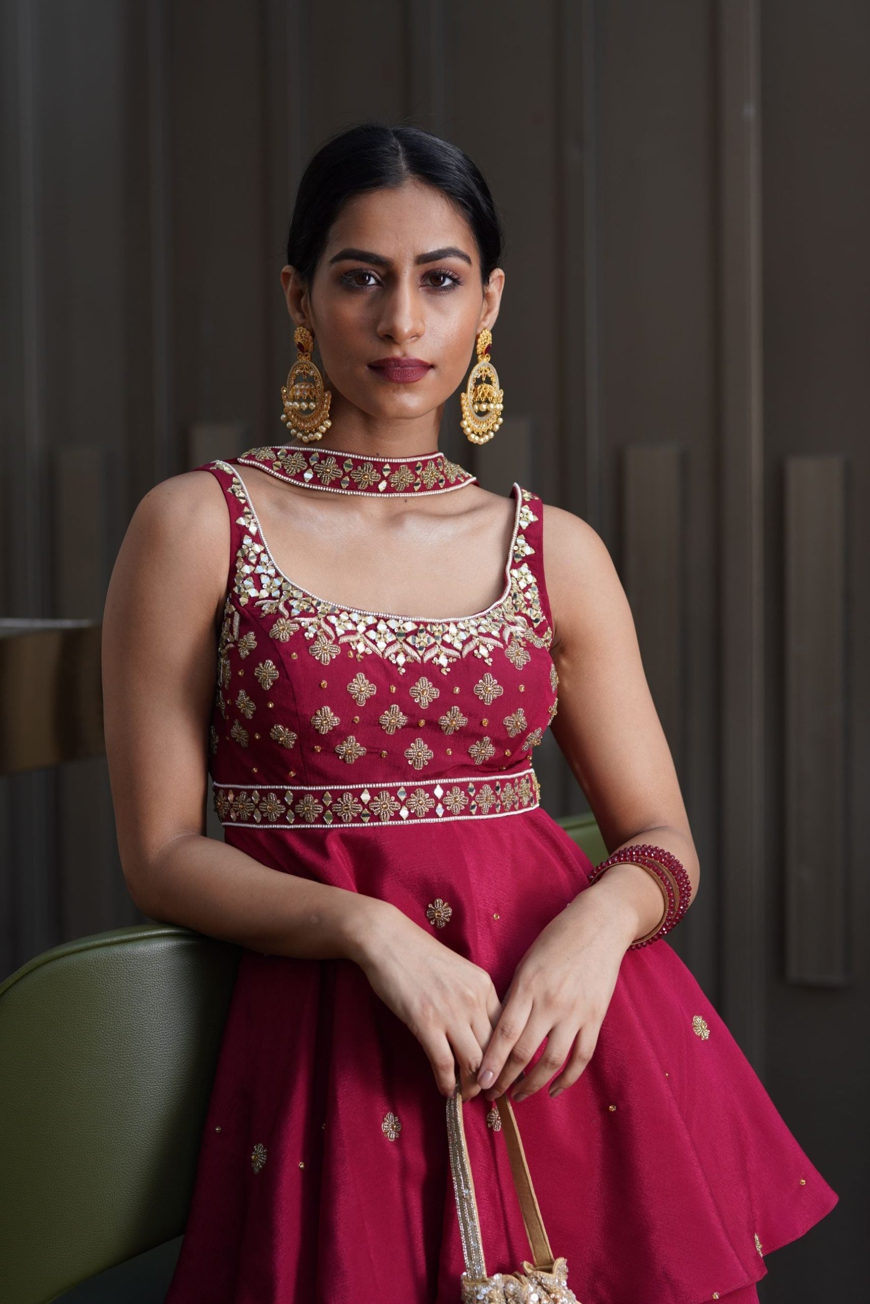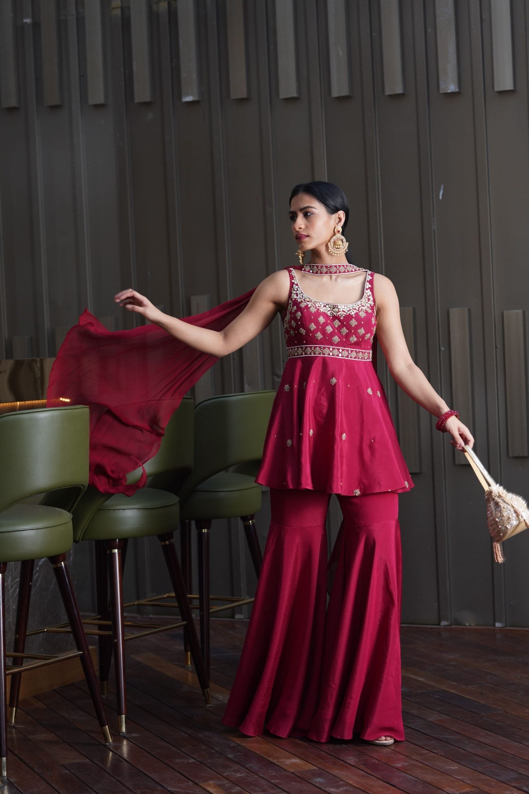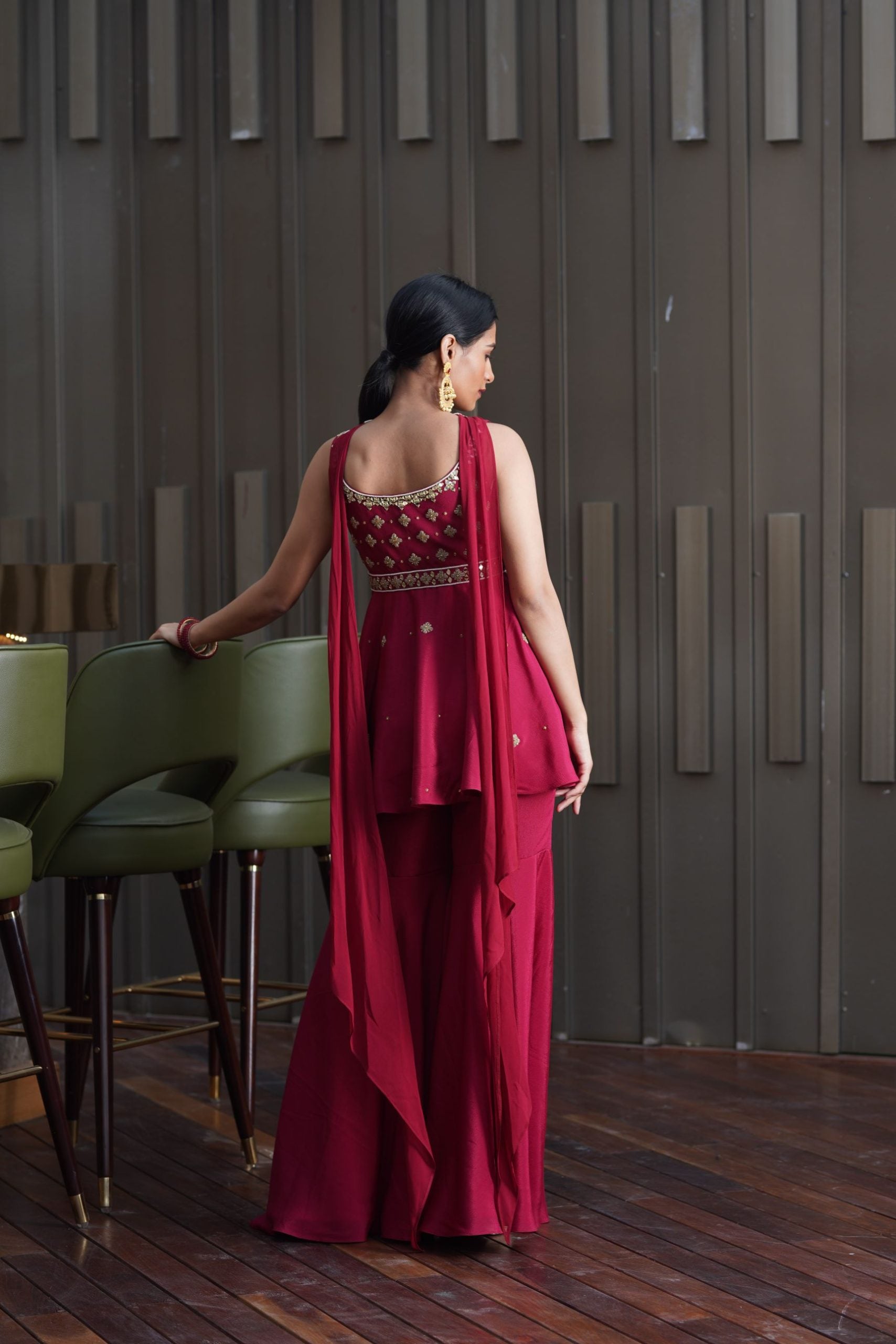 Maroon Shantoon Embellished Kurta And Sharara Set