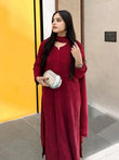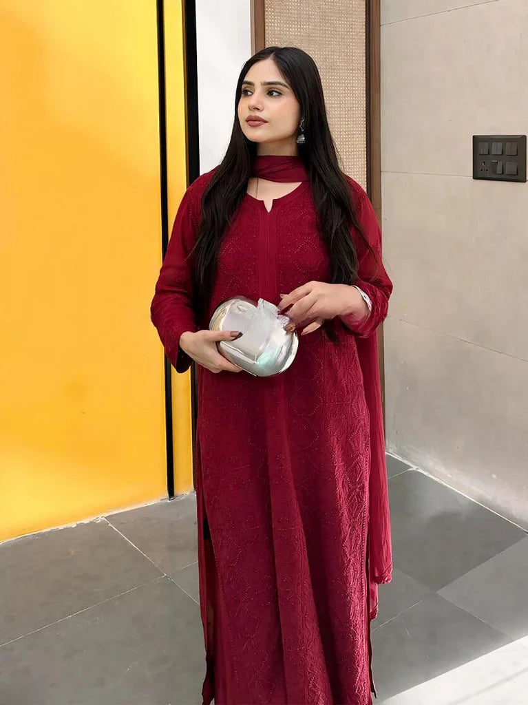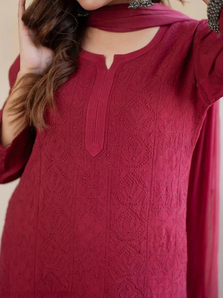 Maroon Viscose Georgette Chikankari Kurta Palazzo With Dupatta Set