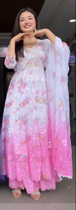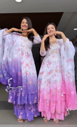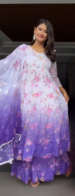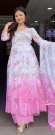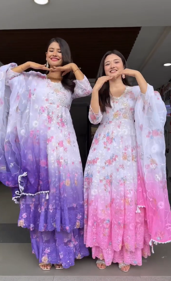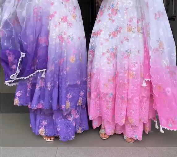 This three-piece set features a Sharara set adorned with delicate embroidery across the front, blending classic detail with a modern cut. Paired with Embroidered pants elevated with lace accents, the ensemble offers a refreshing wardrobe choice for festivities.