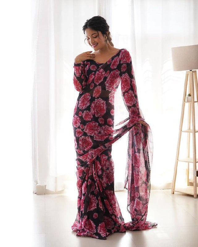 Premium Georgette With Digital Print With Heavy Lace Border*( Ready To Wear )