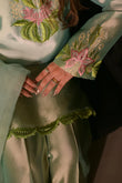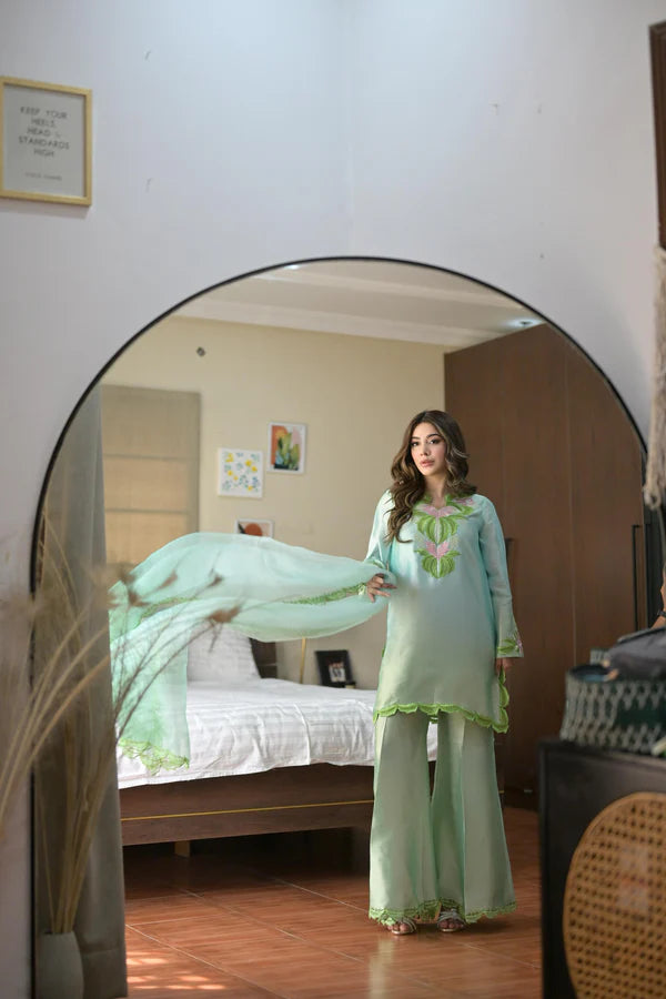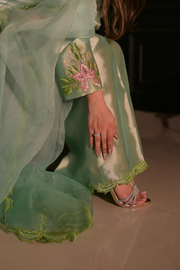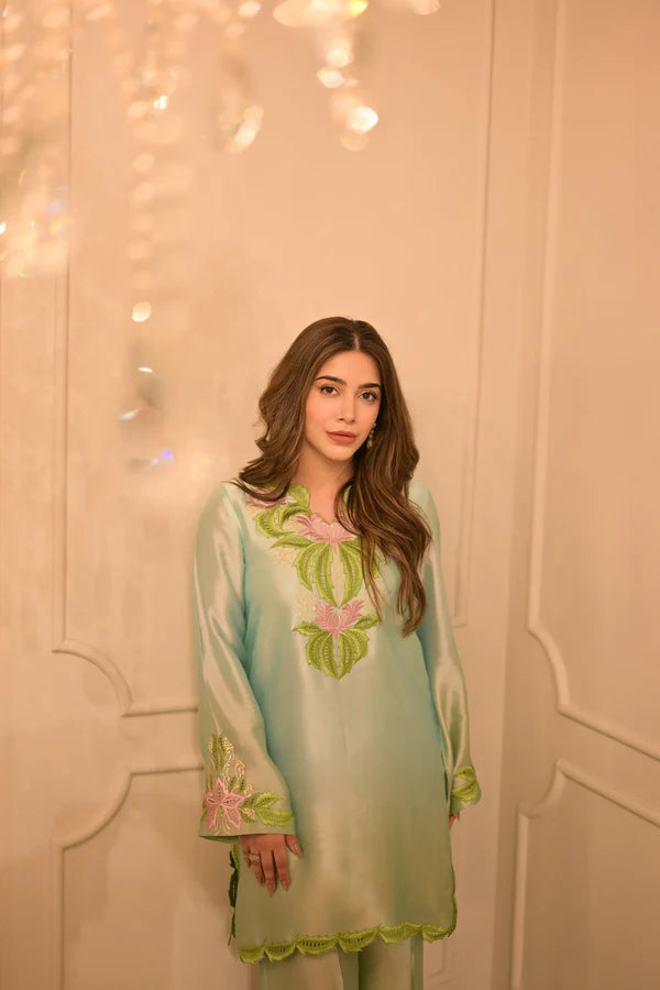 Skydew is a dreamy ombré ensemble in soft shades of light blue and green. Made from pure Shisha silk, it features an inner lining and intricate embroidery in pink and green. The neckline, border, and chalk are adorned with delicate cutwork and the organza dupatta adds a touch of charm with its two-toned design and four-sided cutwork finish. The trousers are also expertly crafted with a delicate hem to complete this elegant and comfortable set.
