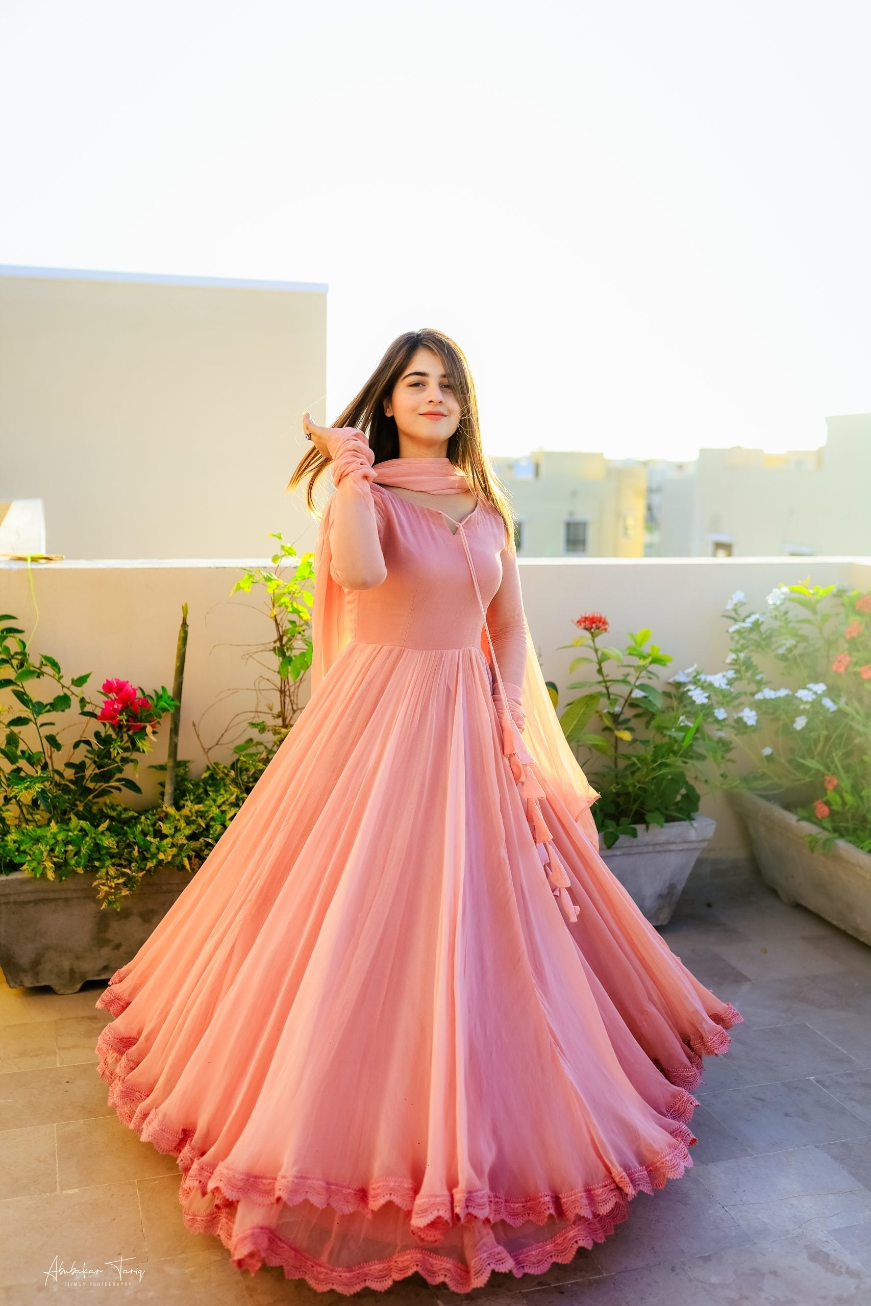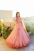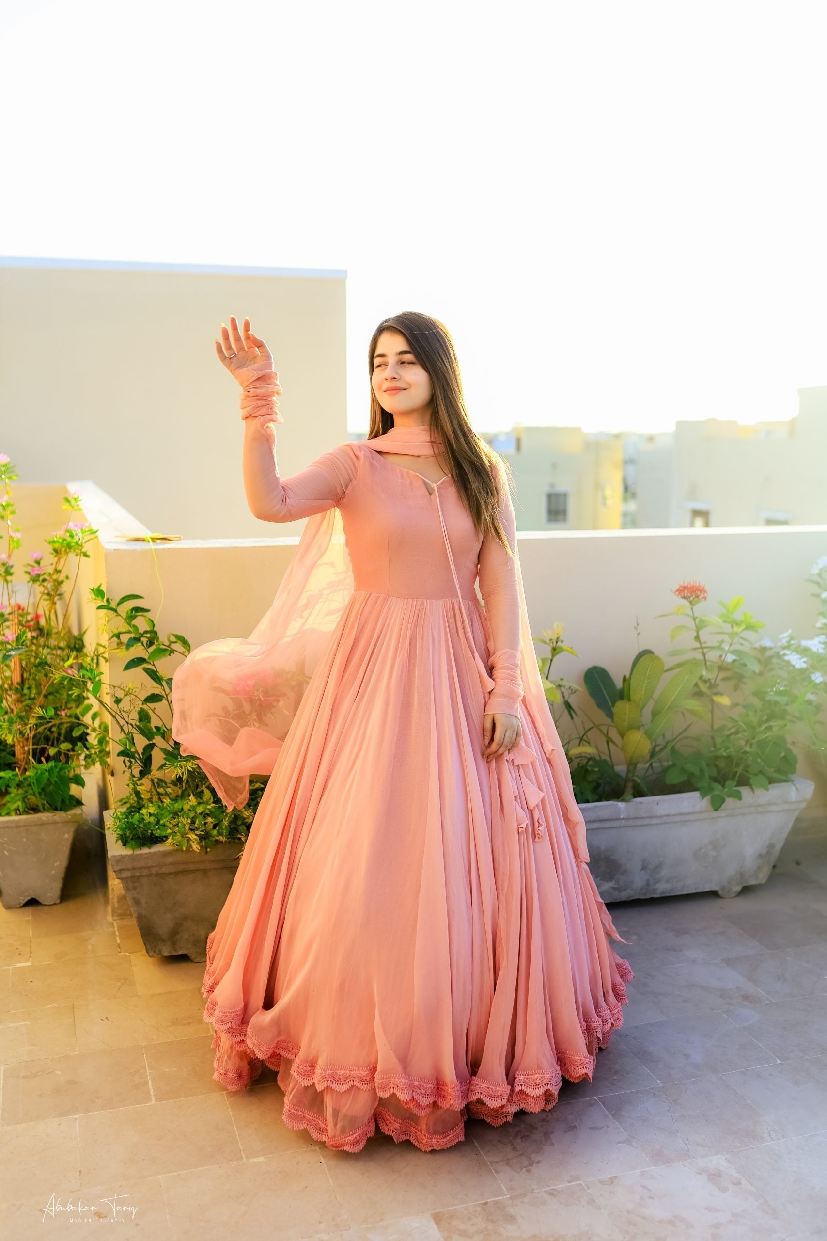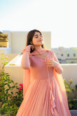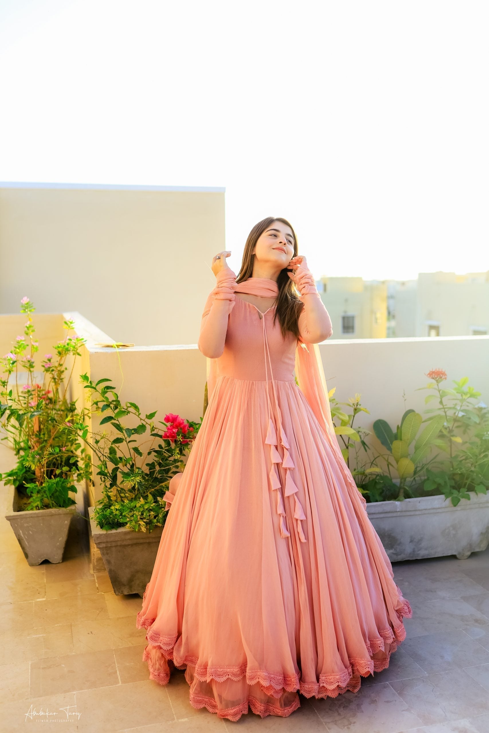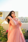 Solid Peach Long Flared Double Layered Anarkali With Dupatta