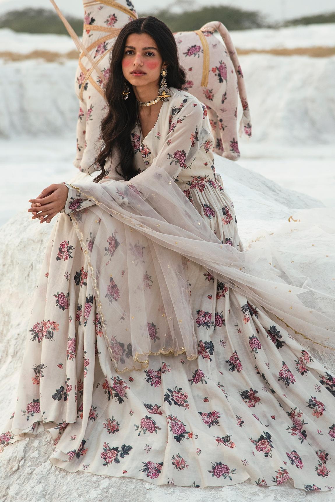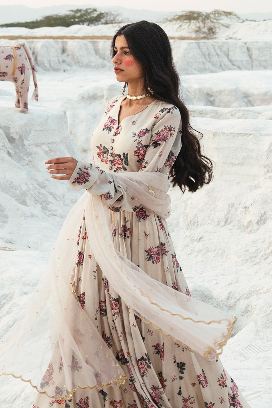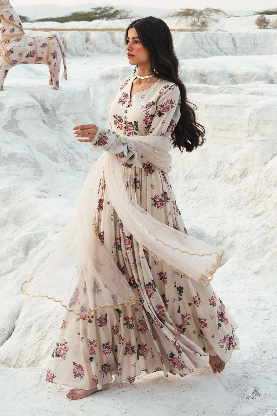White Georgette Printed Anarkali With Dupatta