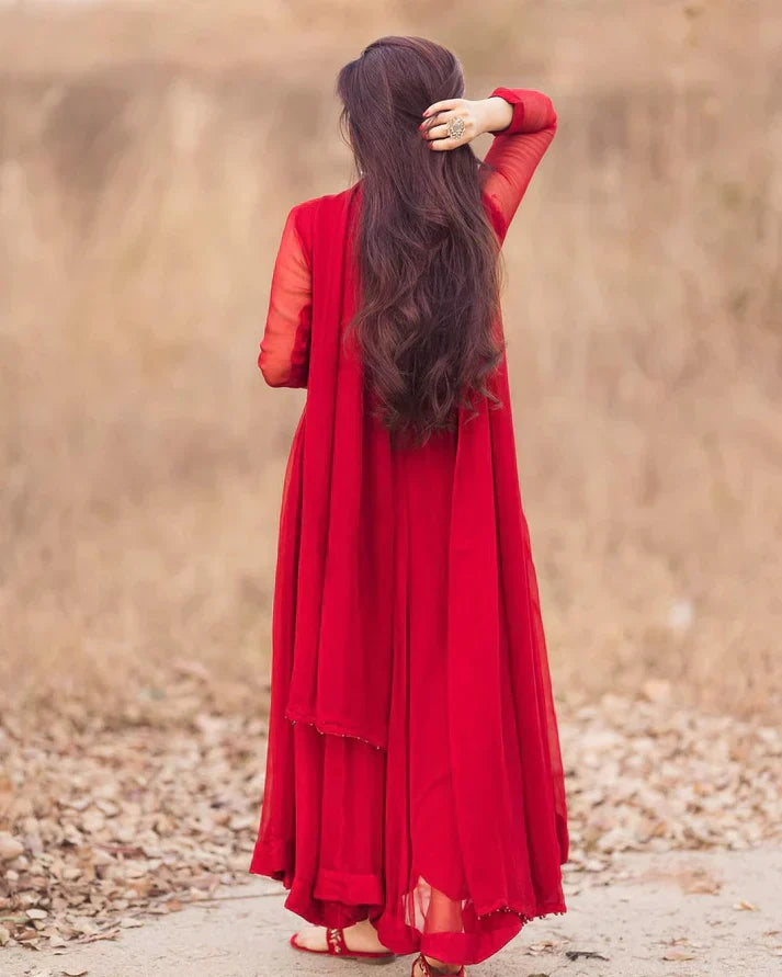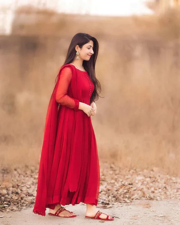 Women Beautiful Ethnic Gown With Dupatta Fox Georgette Red