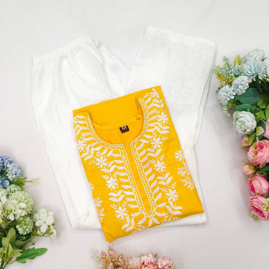 YELLOW CHIKAN EMBROIDERY Kurti_Pent Design