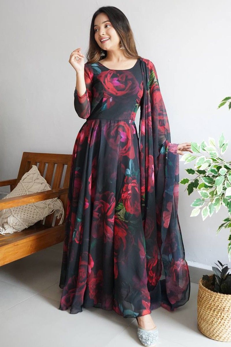 Women Printed Organza Anarkali Kurta With Attached Dupatta