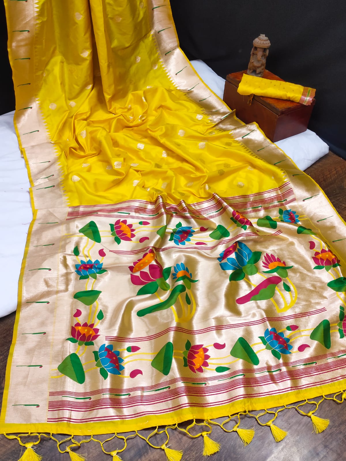 Yellow Banarasi Soft Silk Paithani With Zari Border Saree